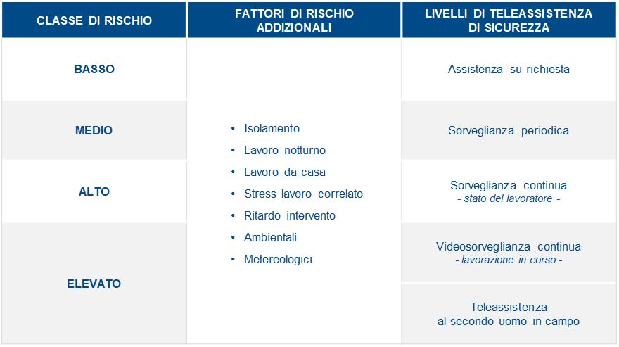 In relazione ai rischi specifici delle diverse attività operative, il lavoro in solitudine o temporaneamente isolato aggiunge alcuni fattori di rischio addizionali che sono efficacemente contrastati da progressivi livelli di teleassistenza di sicurezza.